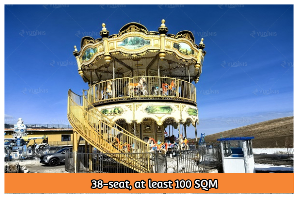 The 38-seat carousel is 11m in diameter and 11.5m in height(including the height of the top decoration). You need to prepare at least 100 SQM(including the fence size) ground area to buy the 38-seat one.