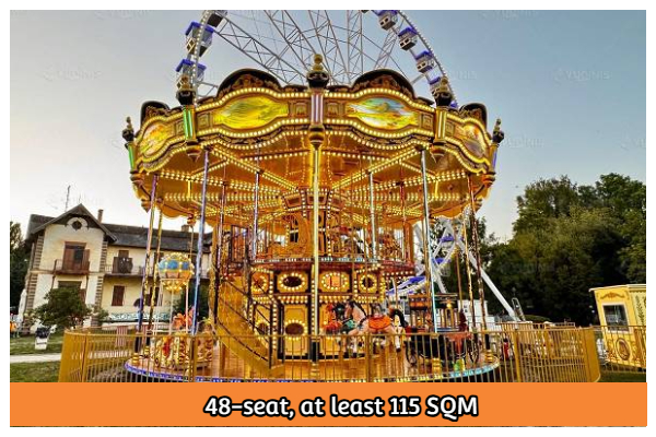 The 48-seat merry-go-round is 12m in diameter and 11.5m in height. You need to prepare at least 115 SQM(including the fence size) ground area to buy the 48-seat one.