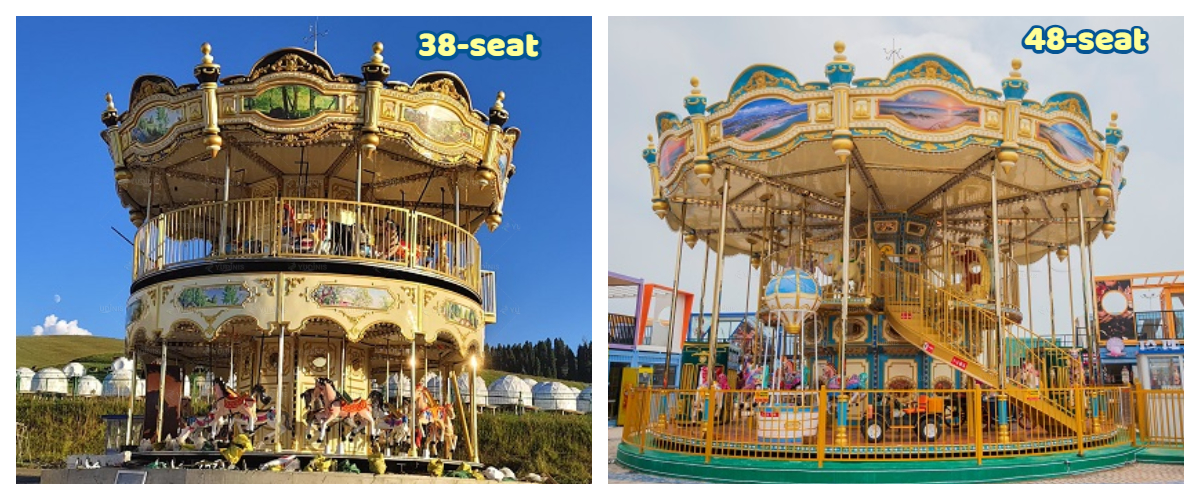 At Dinis Factory, 38-seat and 48-seat double-storey carousels are the two regular and also hot-selling sizes. They are mainly different in capacity, size, and price. So, how to choose to suit your indoor place? The following parameters may help you make a choice.