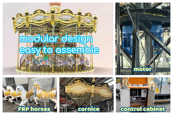 The center columns, stairs, FRP horses, cornice, etc, can be disassembled easily. During shipping, we disassemble these components in advance, and upon arrival at your indoor site, we begin to install them one part at a time.